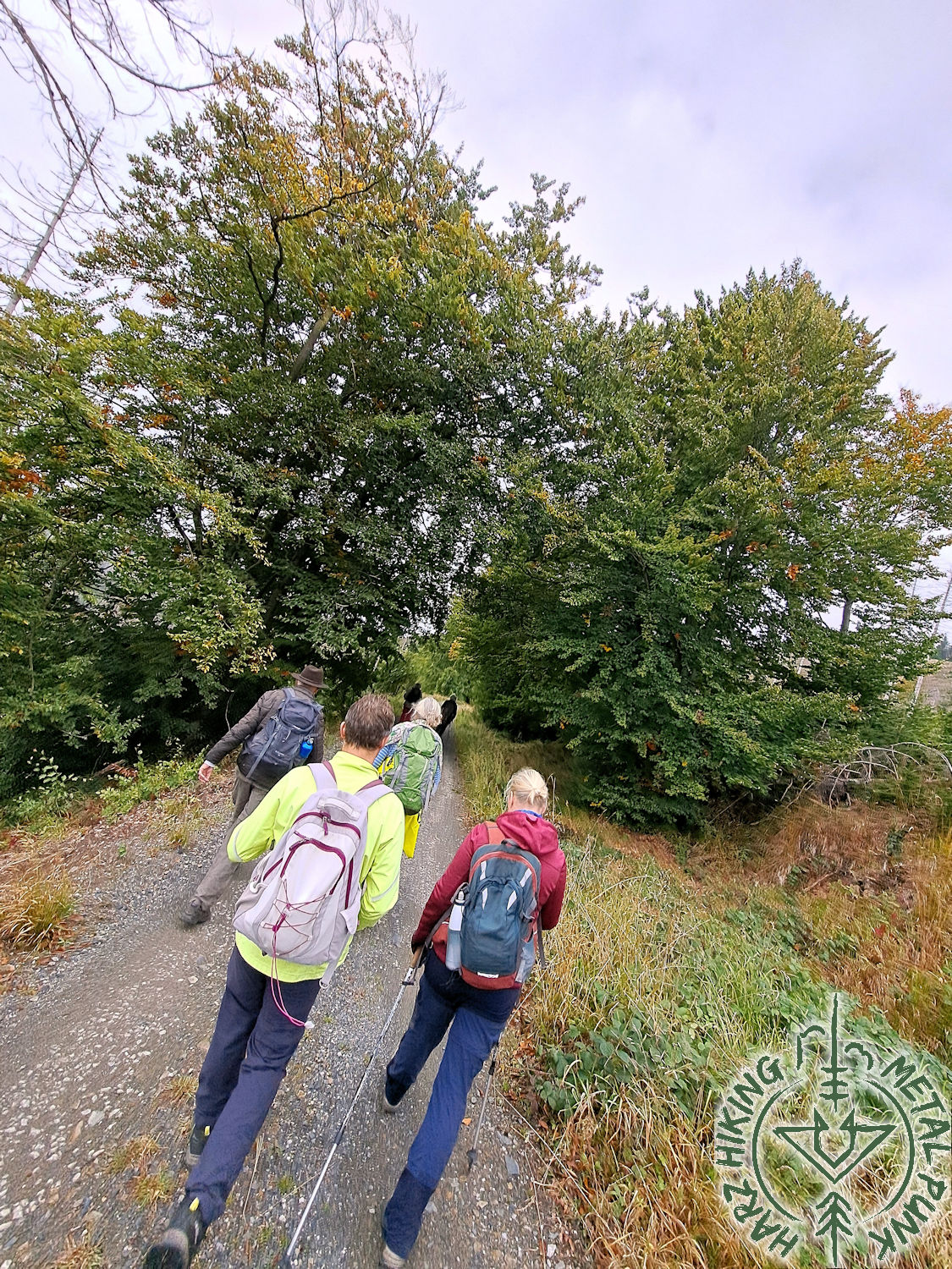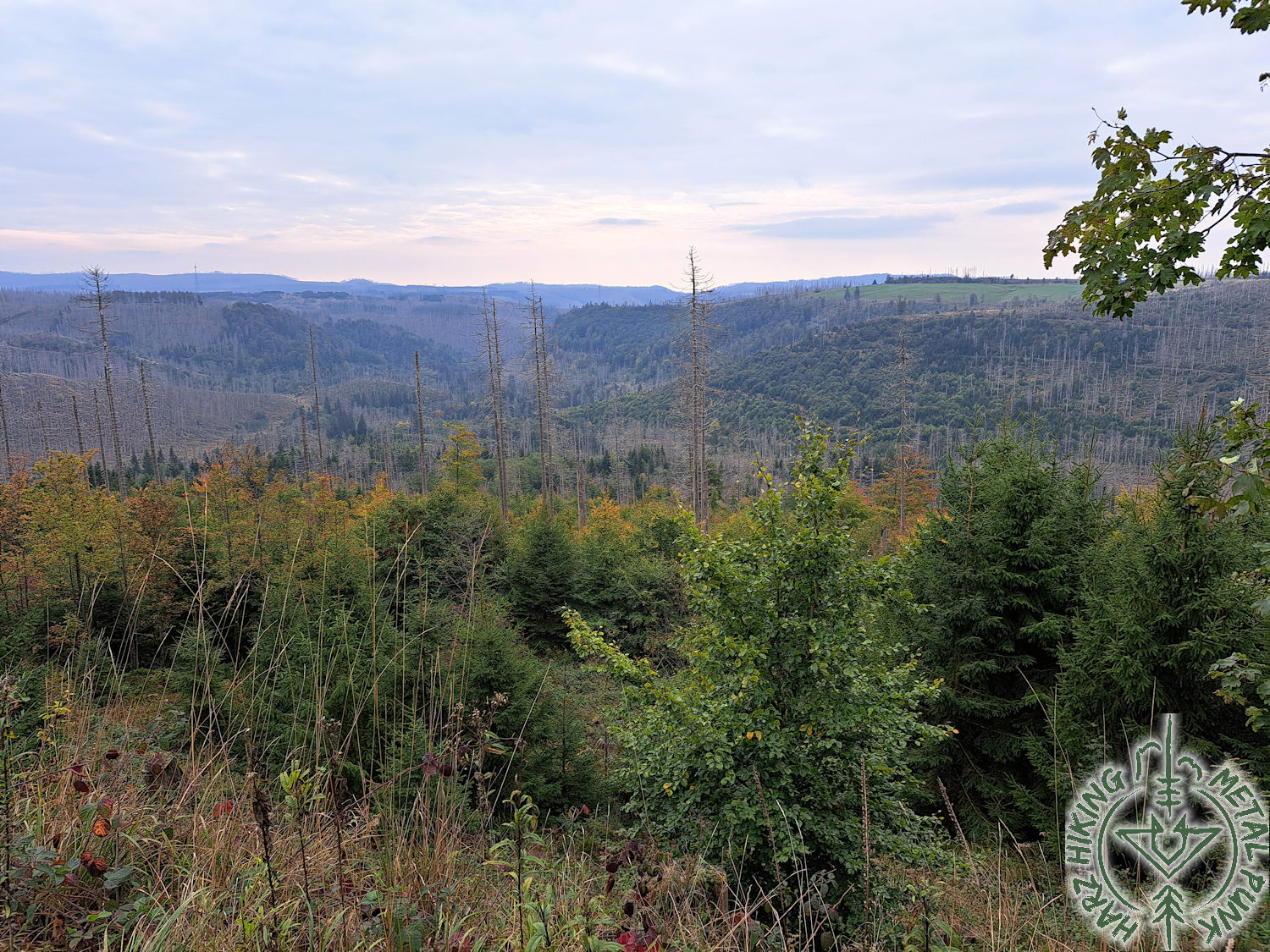 Nach der wohlverdienten Pause begrüßte uns draußen die Herbstsonne. Während wir danach entlang des Sonnenberger Grabens langsam den Rehberg erklommen, röhrte ein liebestoller Hirsch aus dem Siebertal herüber. Vom Planweg eröffnete sich das Höhen-Panorama über die Jordanshöhe gen Ravensberg bei Sachsa und vom Wurmberg über die Achtermannshöhe zum Brocken bis hin zum Torfhause.