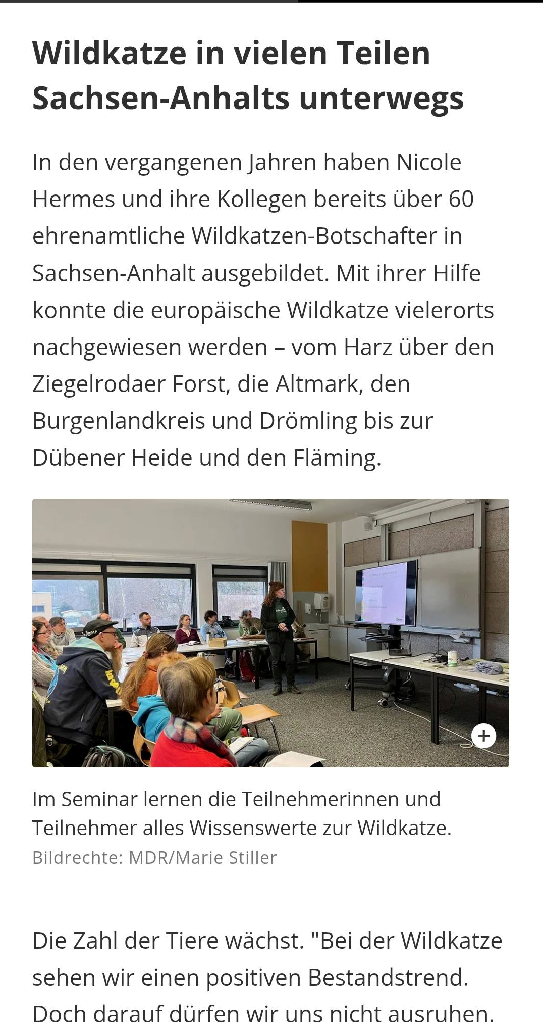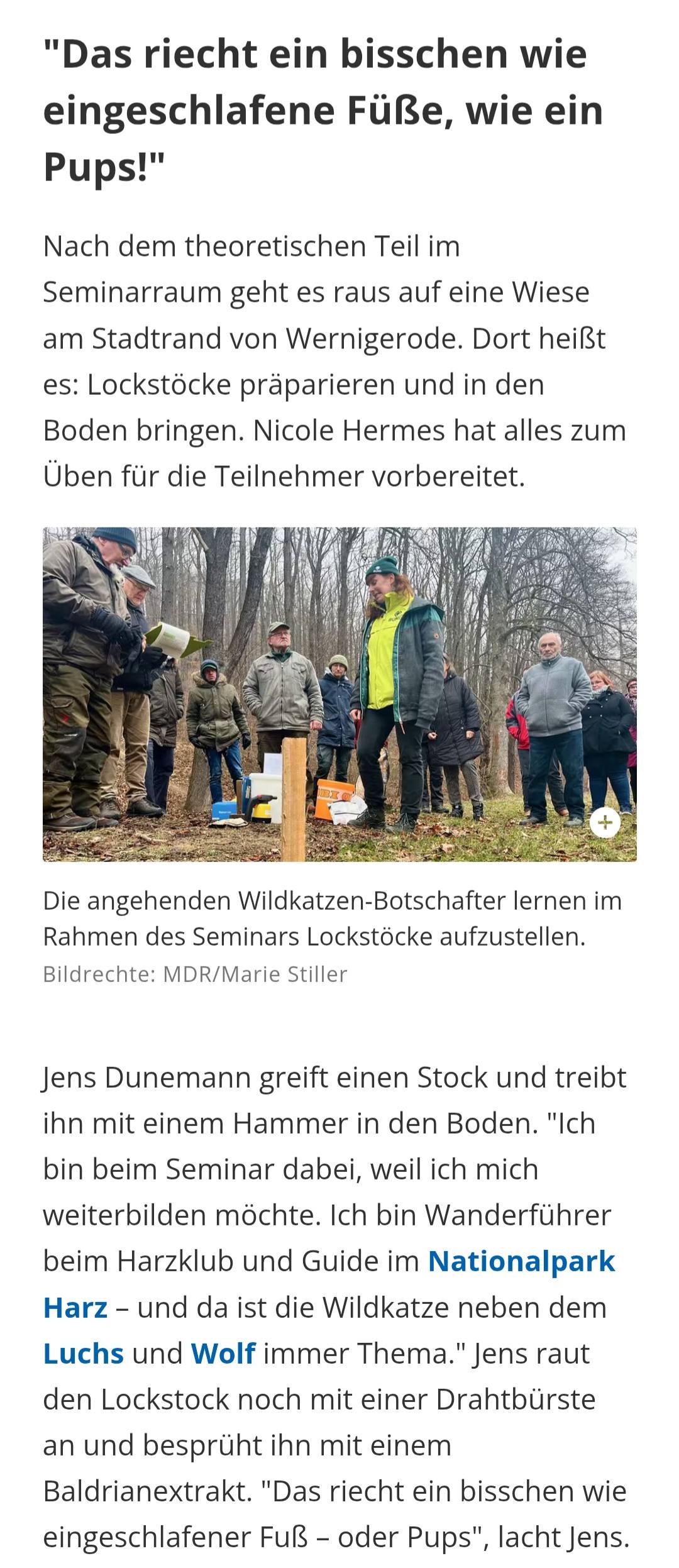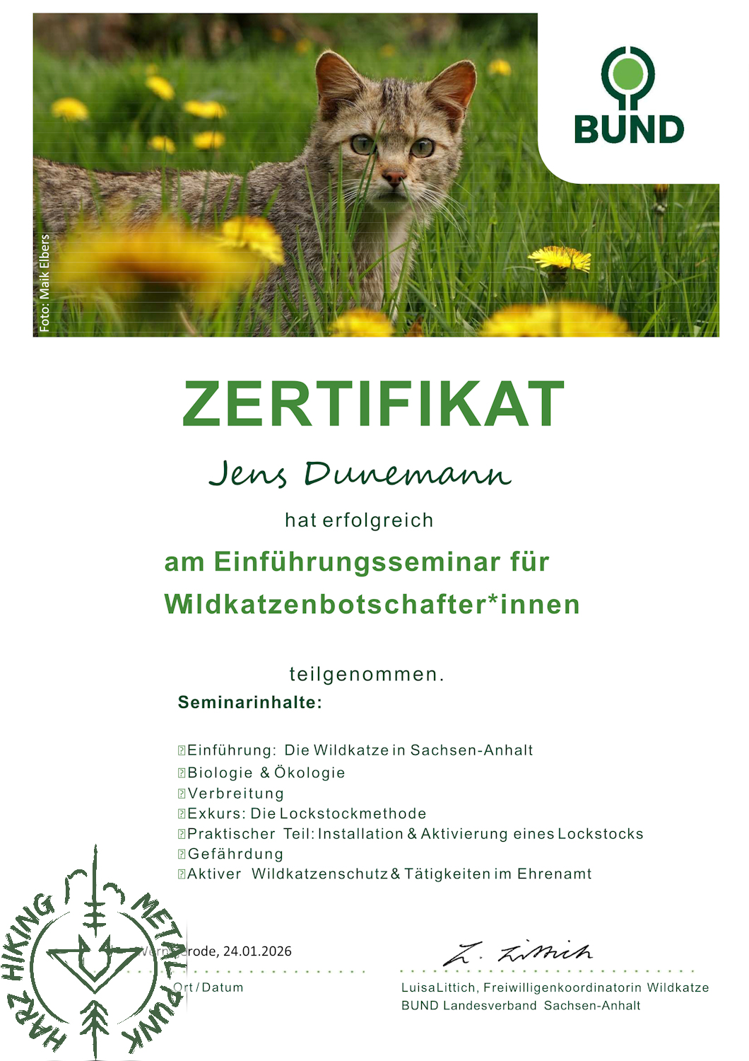 In dem eintägigen Seminar konnte ich mich unter der Anleitung von Biologin Nicole Hermes und Luisa Littich, der Freiwilligenkoordinatorin Wildkatze beim BUND Landesverband Sachsen-Anhalt noch einmal umfassend in das Thema „Wildkatze“, deren Verbreitung, Biologie, Ökologie, Gefährdung sowie in Theorie und Praxis mit der Lockstock-Nachweismethode einarbeiten und darf mich seither Wildkatzenbotschafter nennen.